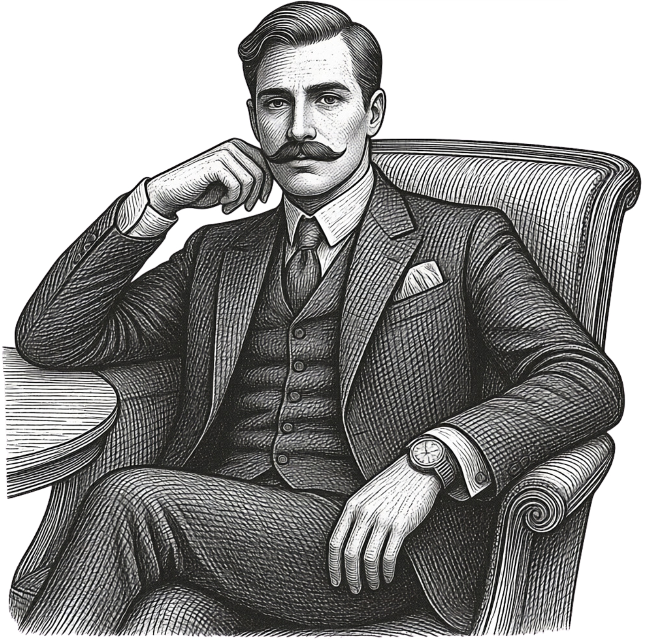 Tuba, mis polnud kuigi suur, oli sisustatud nagu külalistetuba, paks pehme vaip kattis kogu põrandat. Tugitoolis, selg akna poole, jalad ristis ja küünarnukk hinnalisel lauakesel, istus viimase moe järgi riides noor mees, pea püsti. Ta vaatas suurte siniste silmadega otse enda ette, roosal, mustadest vurrudest varjutatud näol hõljus endaga rahulolev naeratus. Lühidalt öeldes, see oli täpipealt mannekeen vaateaknalt. Jäime kõik tema ette seisma.